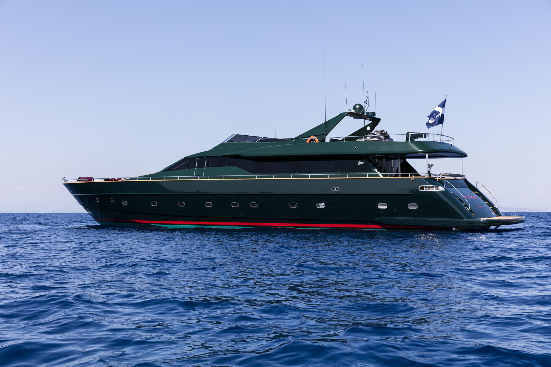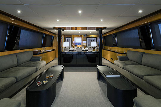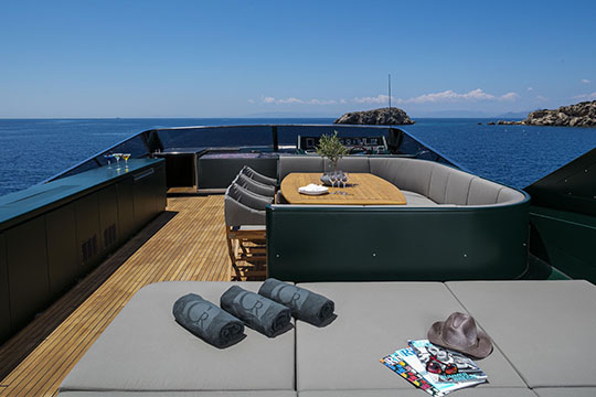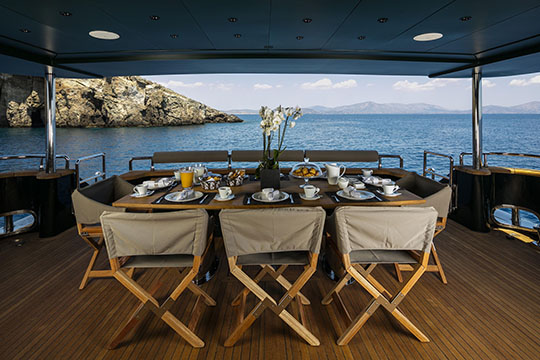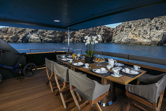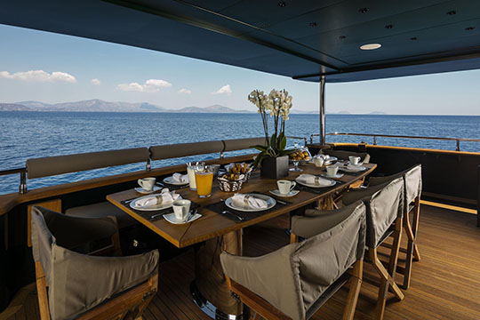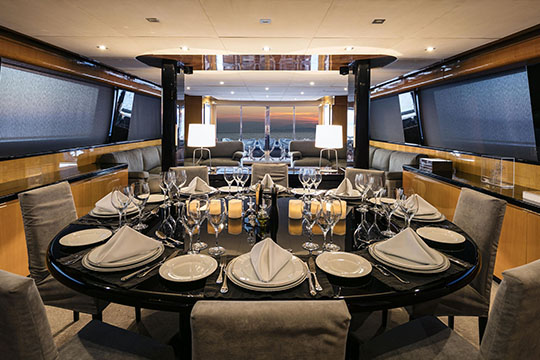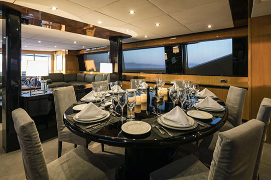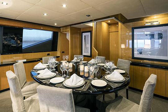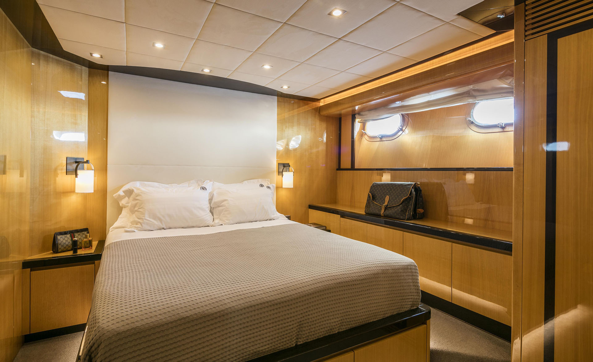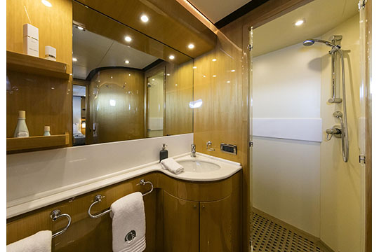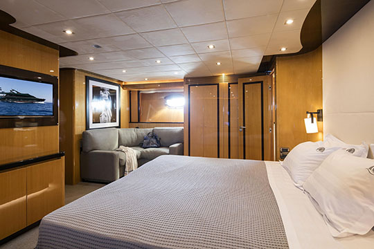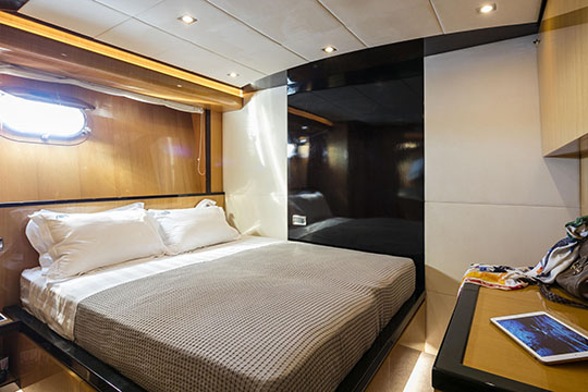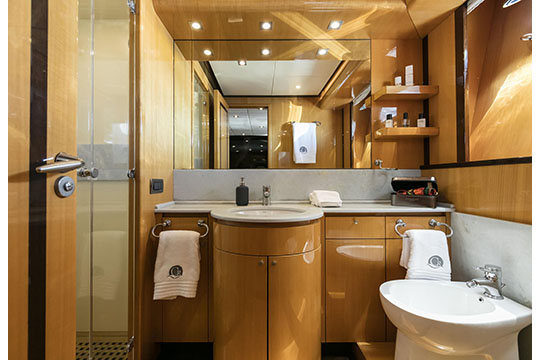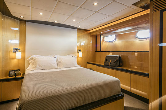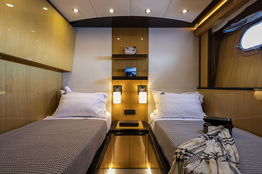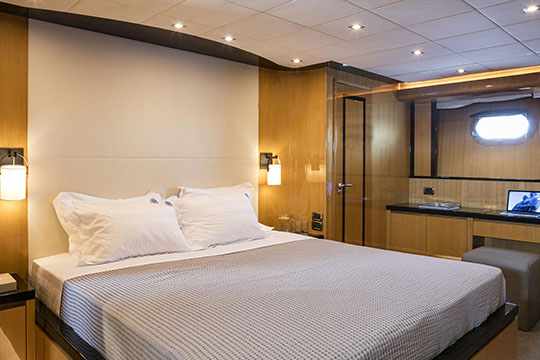 One Master cabin with king size bed and en-suite facilities. One VIP cabin with queen size bed and en-suite facilities. One double cabin with a double bed and an additional Pullman berth with en-suite facilities. Two twin cabins, each with one additional Pullman berth and en-suite facilities, that can be also converted to doubles. A 6th cabin/playroom is available with an upper/lower berths sharing a W.C. with another cabin.