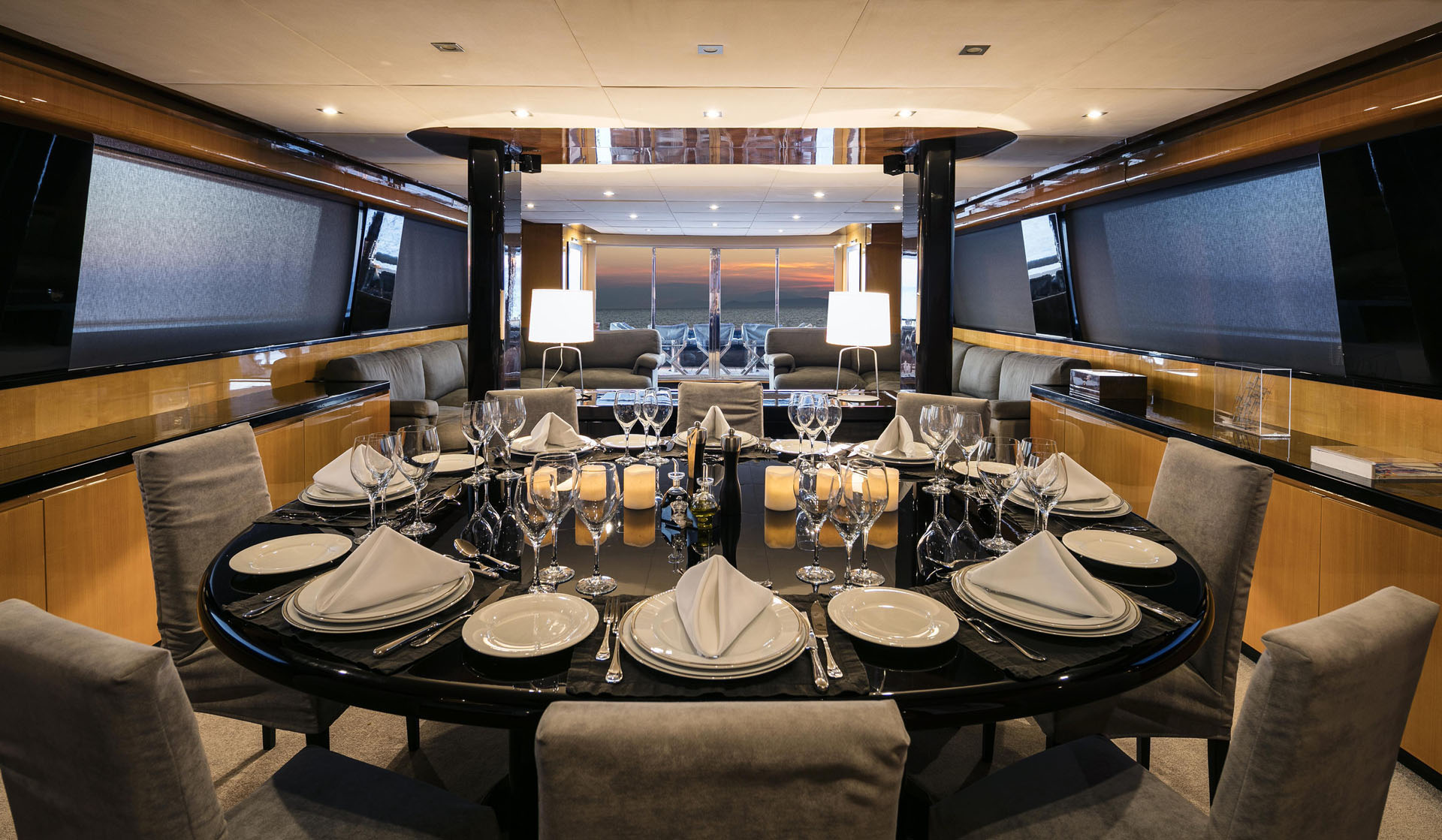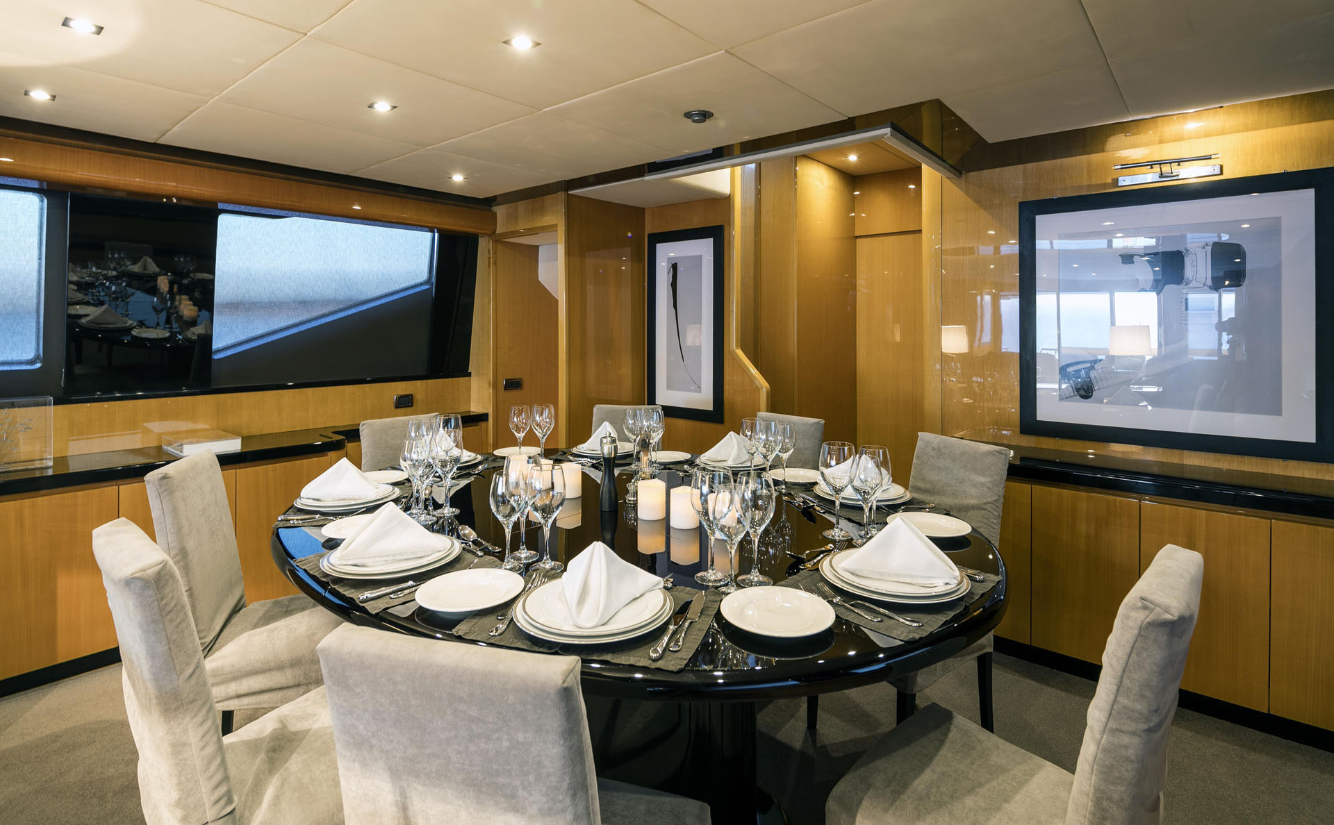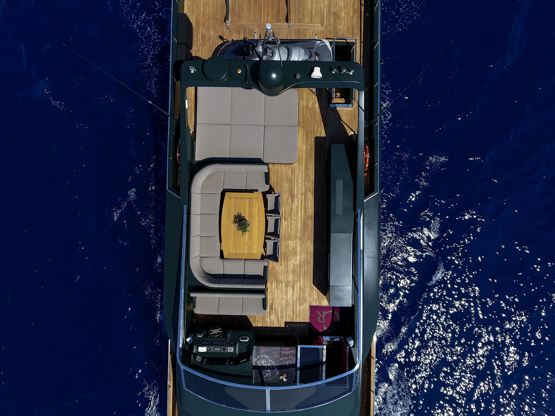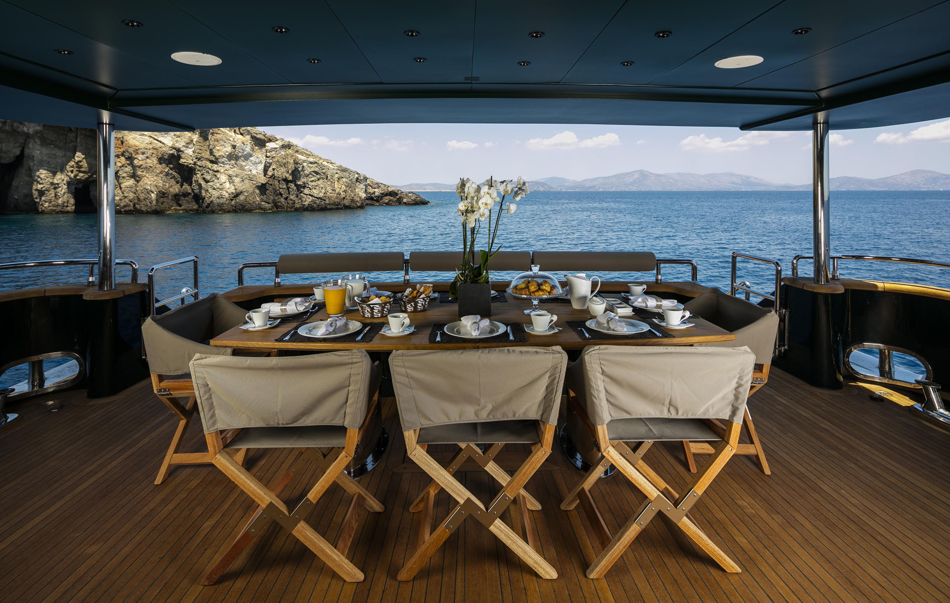 One Master cabin with king size bed and en-suite facilities. One VIP cabin with queen size bed and en-suite facilities. One double cabin with a double bed and an additional Pullman berth with en-suite facilities. Two twin cabins, each with one additional Pullman berth and en-suite facilities, that can be also converted to doubles. A 6th cabin/playroom is available with an upper/lower berths sharing a W.C. with another cabin.